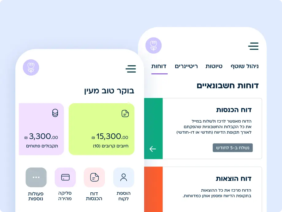 הכלים הבסיסיים שכל עסק צריך: הפקת חשבוניות אונליין, מסמכים ודוחות בשניות, גישה לרו״ח לביצוע פעולות, מעקב אחרי חיובים פתוחים, תזכורות ללקוחות ועוד