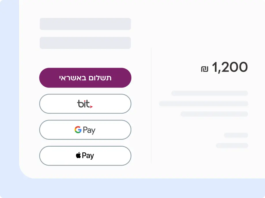 כשנוח ללקוחות שלך לשלם, הכסף מגיע מהר יותר – החיבור לתשלומים דיגיטליים מאפשר לקבל תשלום אונליין מהלקוחות באשראי, bit וארנקים דיגיטליים עם חשבוניות אוטומטיות ובמינימום מאמץ