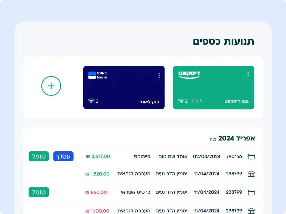 חיבור נוח ומאובטח בין חשבונות הבנק וכרטיסי האשראי שלך ישירות לחשבון ב-morning! זה מאפשר לצפות במידע הפיננסי של העסק במקום אחד ולבצע פעולות ישירות מתנועות העו״ש והאשראי