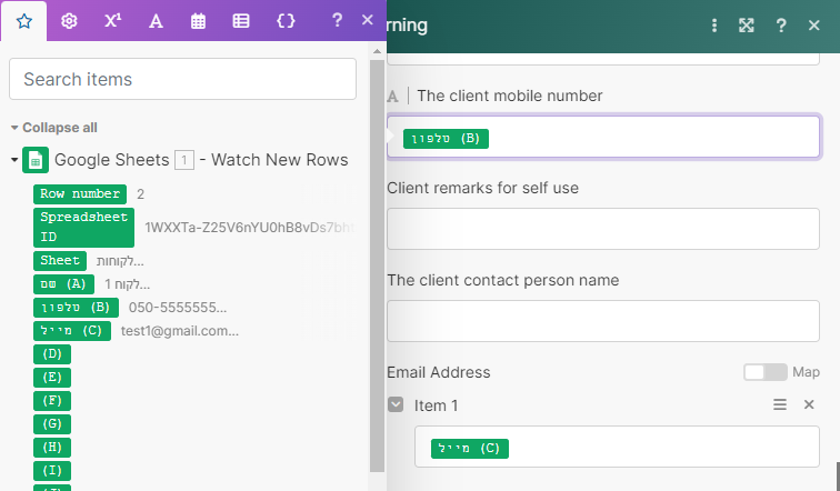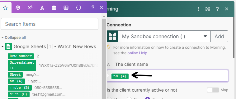 נשאר רק לשייך לכל נתון במורנינג את המידע הרלוונטי מתוך Google Sheets. למשל – תחת The client name נכניס את השם: