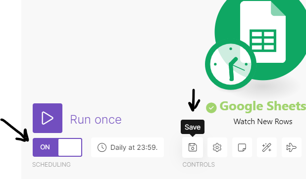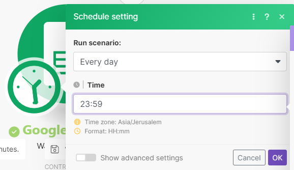 12. האוטומציה מוכנה! ניתן להכניס כמה שורות ל-Google Sheets ולערוך ניסיון כדי לראות שהכל עובד כמו שצריך. רגע לפני שנפעיל את האוטומציה, חשוב להגדיר מתי ובאיזו תדירות היא תפעל. כרגע לשם ההדגמה נבחר שהאוטומציה תרוץ פעם ביום בשעה 23:59: