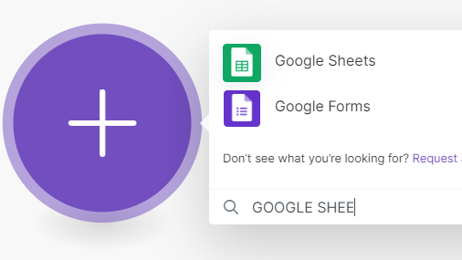 זה המסך שבו נבנה את התהליך עצמו. נבחר את האפליקציה שממנה נרצה לשאוב נתונים כדי ליצור על בסיסם כרטיסי לקוח במורנינג. במקרה הזה אני מדגימה על Google Sheets אבל אפשר כמובן לשאוב נתונים ממערכת CRM, מטופס באתר או מכל מקור אחר שיכול להתממשק עם Make.