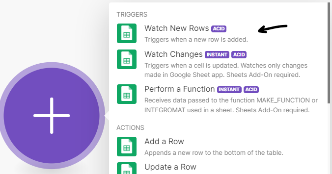 הטריגר הזה בעצם סורק גיליון ב-Google Sheets (בהמשך נגדיר כל כמה זמן תתבצע הסריקה), ובכל סריקה שבה Make יזהה בגיליון שורות חדשות שנוספו – התהליך האוטומטי יופעל עליהן.