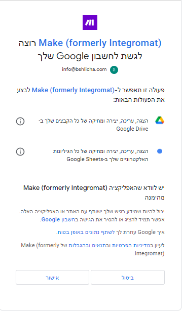 6. כעת, תחת Connection יש ללחוץ על Add ואז על Continue ולחבר את חשבון ה-Google הרלוונטי ל-Make. חשבונות מסוג Google Workspace אפשר לחבר מיידית, אם יש לך חשבון Google רגיל יש לפעול לפי ההנחיות כאן כדי לחבר את החשבון ל-Make.