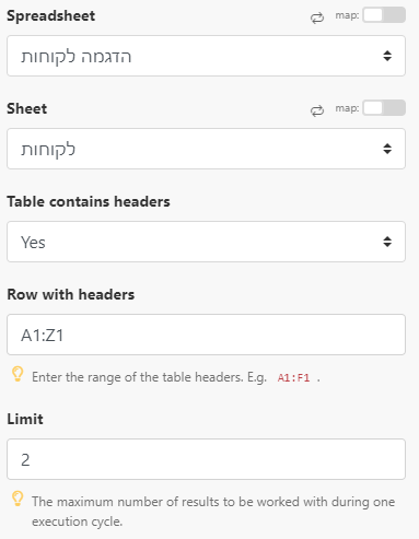 7. אחרי שהחיבור הושלם, נבחר את הקובץ הרלוונטי ב-Google Sheets ובתוכו את הגיליון המתאים. אין צורך לגעת בהגדרות האחרות, רק את ה-Limit אפשר להגדיל (כרגע בכל ריצה של התהליך האוטומטי יישאבו נתונים של 2 שורות):
